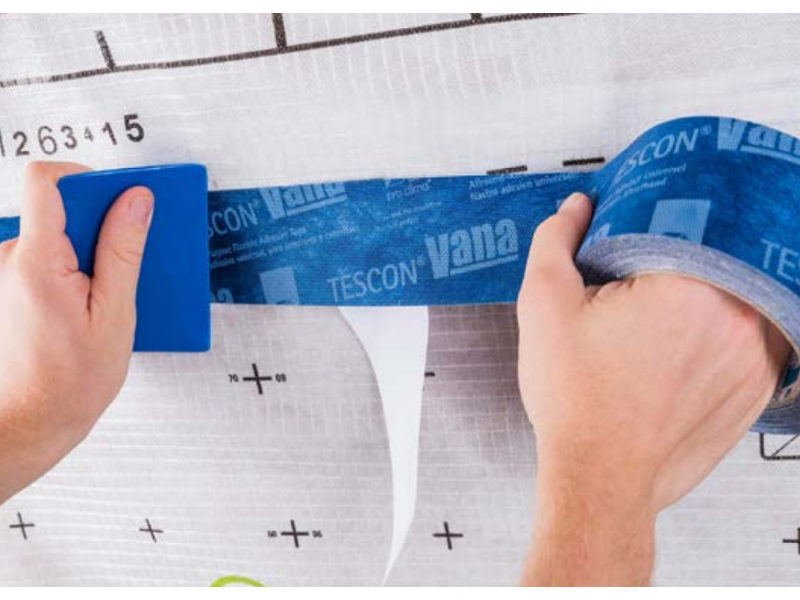 TESCON® VANA is an airtight, vapour-permeable sealing tape designed for reliable connections across a wide range of substrates. Compatible with membranes, underlays, timber, fibre cement, concrete, and masonry, it is flexible, thin, and easy to work with. Its strong adhesive ensures long-lasting airtightness, even on cold surfaces.