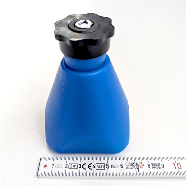 Durable blue bottle with integrated brush and anti-spill top.